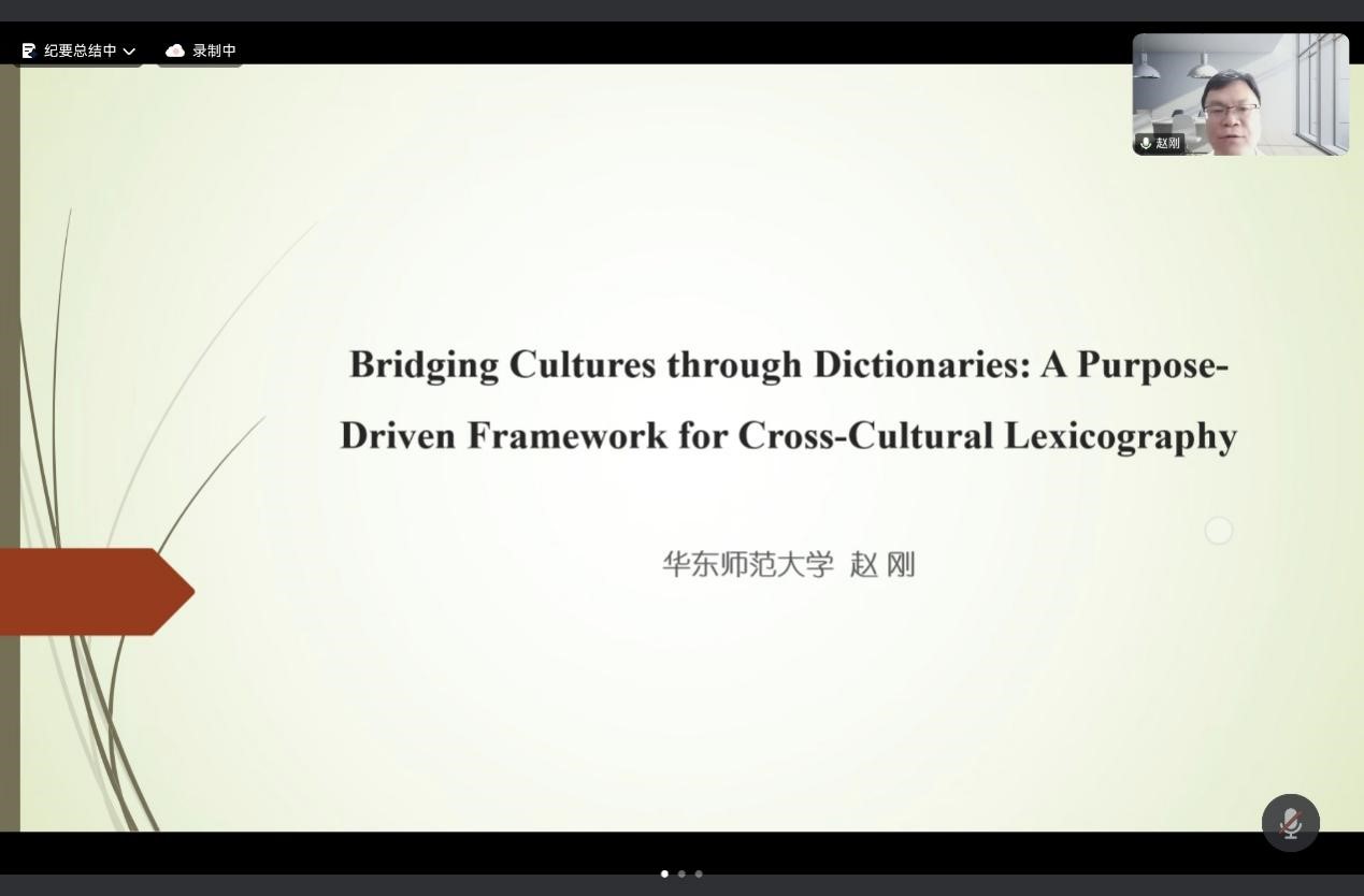 2025年7月8日上午,外语论坛2025年第23讲成功举办。sunbet申搏赵刚教授应邀开展题为“辞书作为文化传播的桥梁:构建目的驱动的跨文化词典学”的精彩学术讲座。本次讲座采用线上和线下结合形式,由陈文革教授主持,陈教授开场中简要介绍了赵教授的研究方向、代表性著作与学术贡献,特别强调其在推动中国文化“走出去”进程中的引领作用。