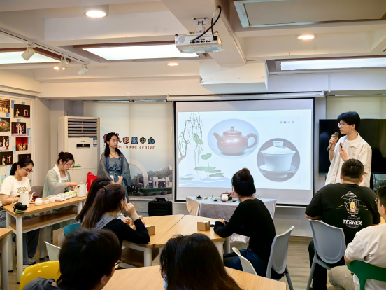 活动伊始,香港员工黎绍聪通过有奖竞答环节开启茶文化学习之旅,生动讲述了中国茶文化的发展历程、工夫茶的起源及其蕴含的待客哲学,让在场师生深刻感受到礼仪之邦的文化底蕴。随后,茶艺汉服展演队的同学们身着传统服饰,以优雅的动作展示了盖碗和紫砂壶的泡饮流程。盖碗表演中"三才碗"象征"天地人"和谐共生,紫砂壶演绎时"关公巡城"展现中华待客之道,让现场观众在欣赏优美茶艺的同时感悟静心养性之道。随后的茶艺体验环节中,境内外各民族学子在展演队同学的指导下亲身体验泡茶、饮茶,感受茶道养生之道。