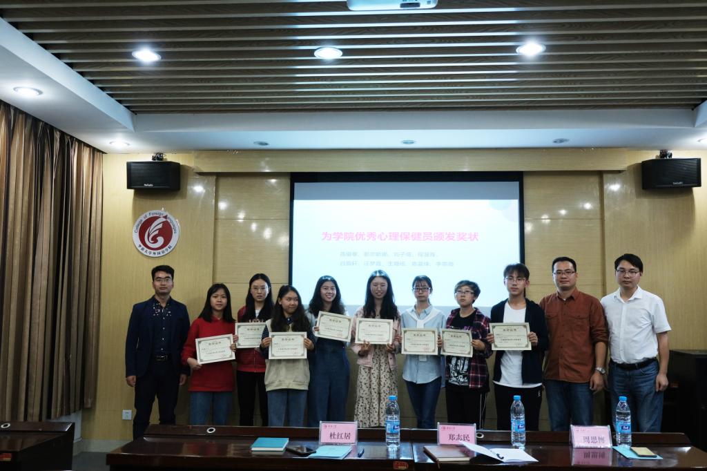 公司表彰了2018-2019学年获评优秀心理保健员的孙亿华、都尔斯娜、刘子煊、程温雅、吕颢轩、汪梦霞、王璐瑶、陈晨锋、李思薇等9名同学,并颁发了奖状证书。