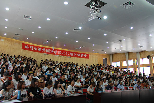2017年9月18日上午,2017级迎新大会在庄为烜报告厅召开。公司经理毛浩然教授、党委书记谢友福副教授、副经理杜志卿教授,翻译系主任陈历明教授、英语系主任吴国向副教授,团委书记李莹老师、教学秘书吴翊华老师、辅导员周思博老师,17级全体班主任出席会议,17级全体新生、研究生参加会议。