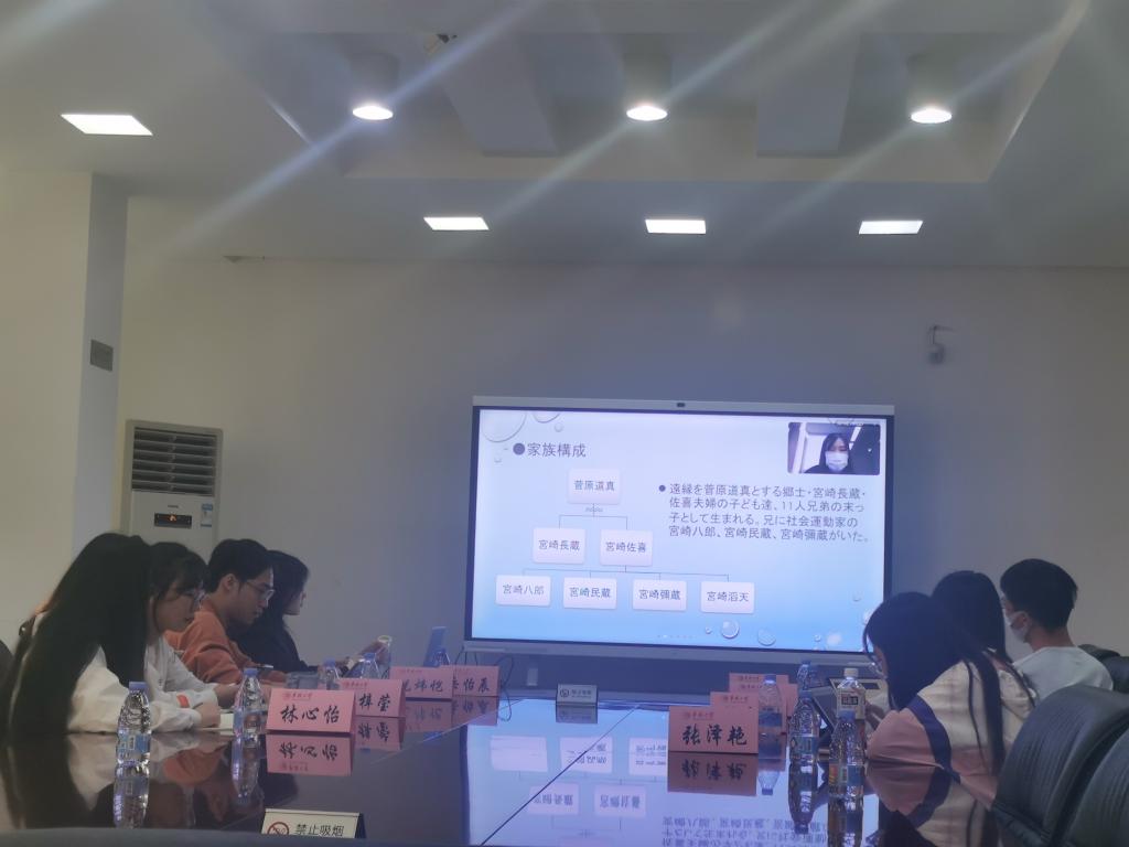 公司岳怡辰同学首先作《泉州市——世界遺産として登録した》(列入世界遗产的泉州)为题的报告,她从泉州申遗成功的事例切入,为日本同学们介绍了泉州的非遗展示点和泉州美食。长崎县立大学内田陽菜同学则为大家介绍了近代坚定真诚地支持中国革命的日本友人宫崎滔天,宫崎家族珍藏着近代中国仁人志士的救国印记的珍贵史料。