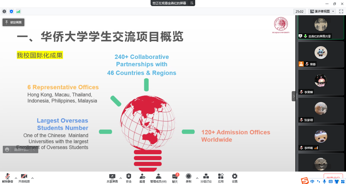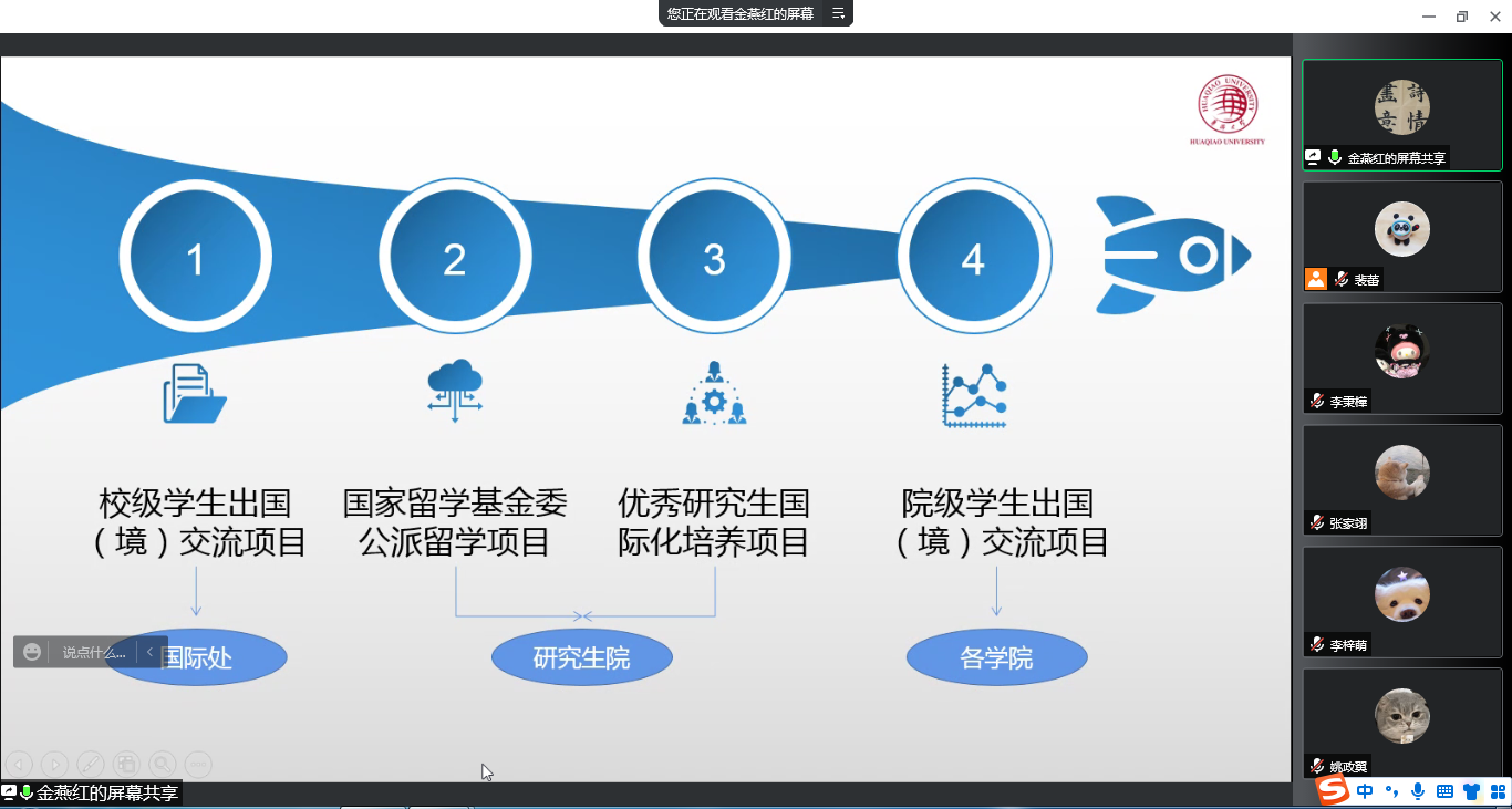 说明会开始,裴蕾老师首先对金燕红老师和同学们的参加表示感谢。由于目前疫情严重,只能线上交流,但同学们仍然积极地参与本次说明会。希望本次说明会能够帮助同学们做好学业规划,为以后申请国际交流项目提前做好准备。
